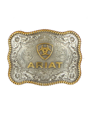 Cette boucle de forme scallopée par M&F Western Products arbore un design du logo Ariat. Le fond est orné de fleurs et de volutes avec un filigrane ajouté pour donner de la profondeur. Accentuée d'une bordure en corde torsadée.