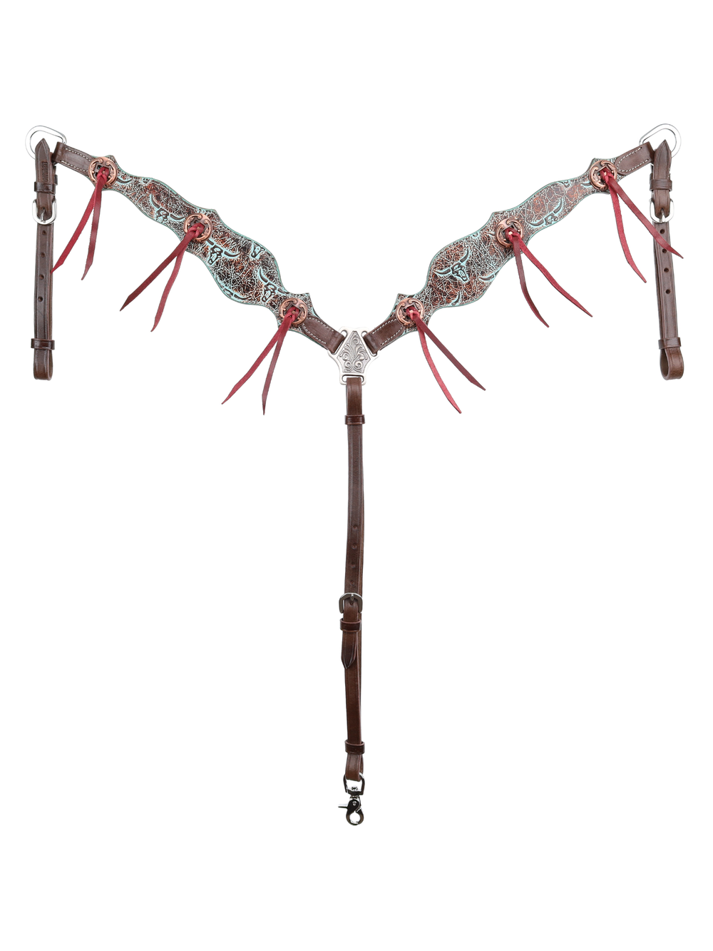 Affirme ton style avec l’ensemble de bride et bricole Western Showman® Weathered Steer, une combinaison parfaite entre robustesse, authenticité et allure rustique.