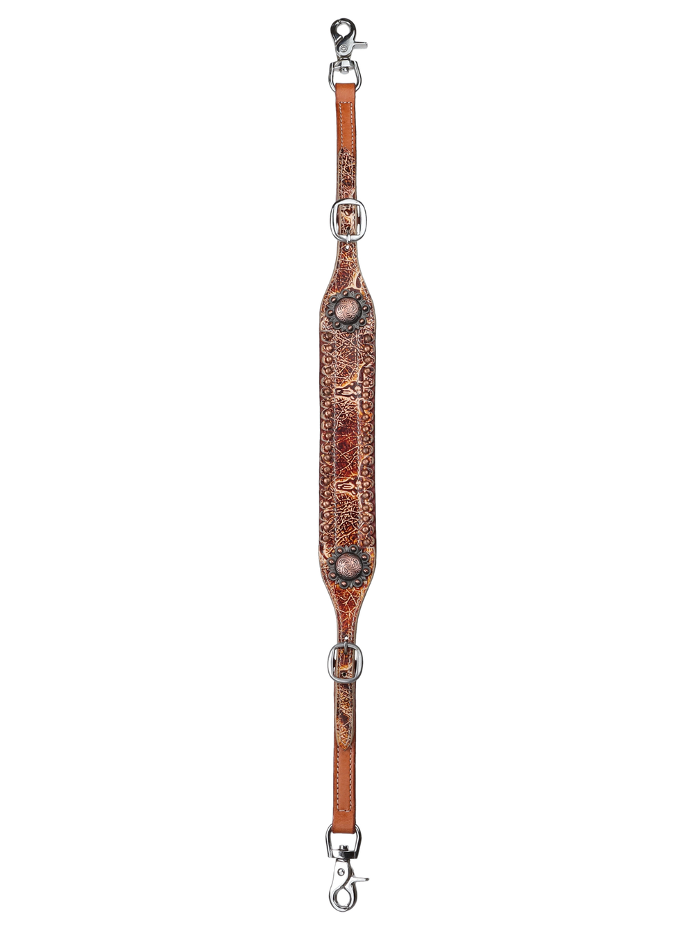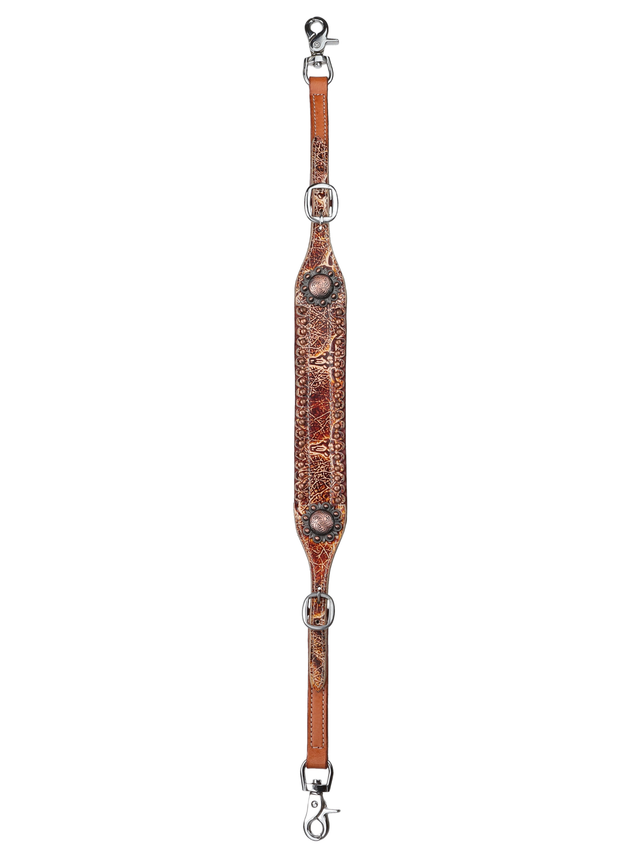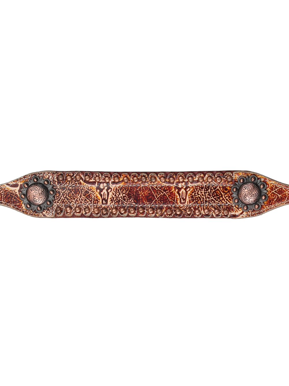 Son style unique se distingue par une superposition à motif de crâne de bison dans des tons tan et crème, rehaussée de conchos cuivrés en forme de baies. Ces détails raffinés apportent une allure authentiquement western à votre harnachement.