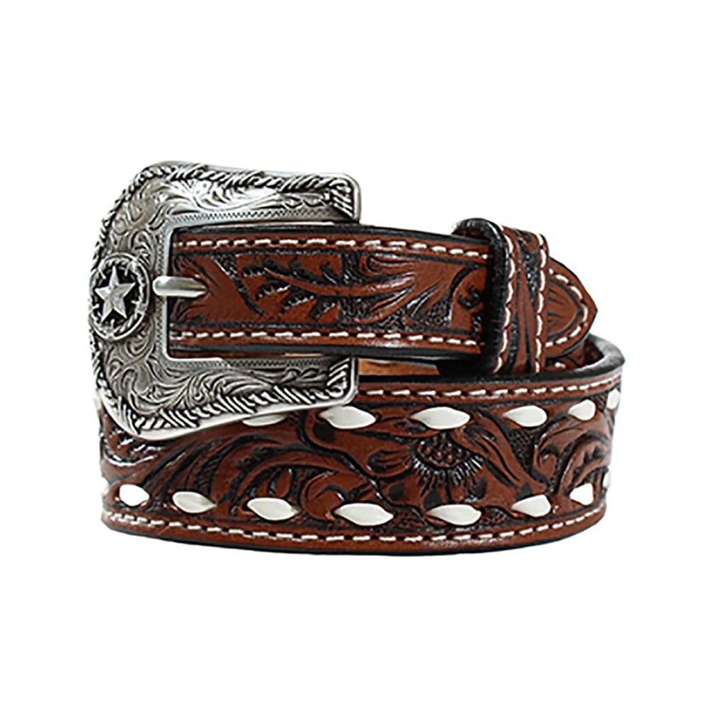 La ceinture pour enfant d'Angel Ranch : une ceinture western frappante pour dames proposée par M&F Western Products. Elle est fabriquée en cuir marron avec une incrustation florale sculptée à la main. Accentuée par des pierres claires sur le sous-cuir et des clous argentés le long des deux bords de la ceinture.