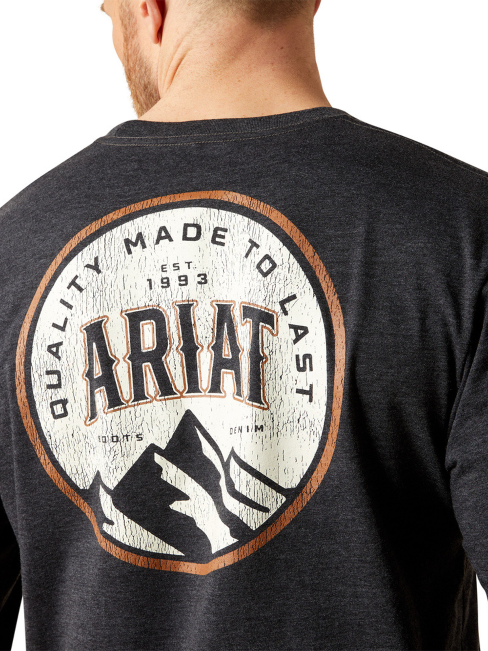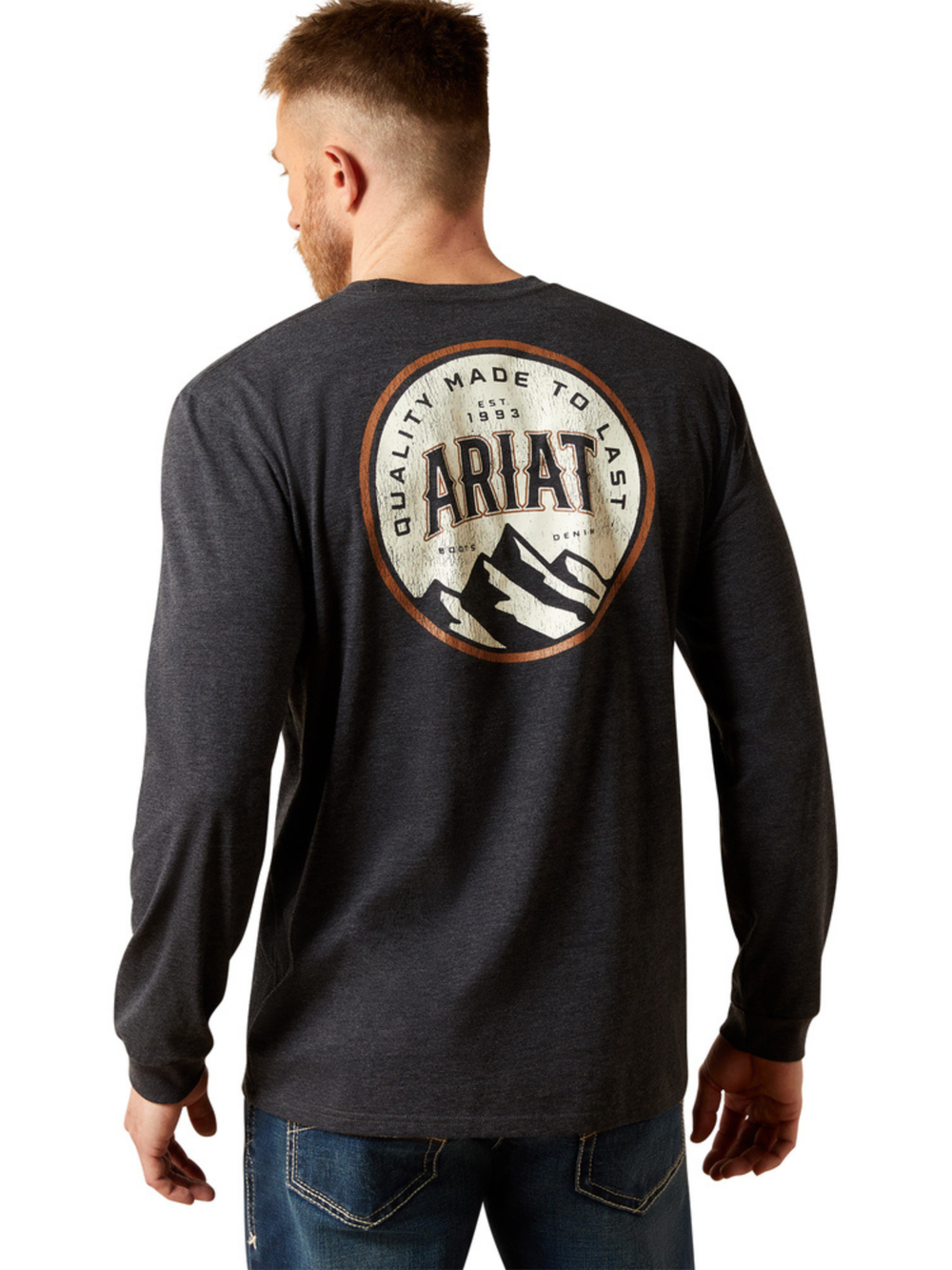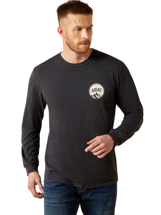 Affichez votre fierté Ariat avec le t-shirt Circle A manches longues pour homme, dans une teinte Charcoal Heather moderne et polyvalente. Conçu pour un confort quotidien, ce t-shirt à col rond et manches longues offre une coupe régulière qui s’adapte parfaitement à tous les mouvements, que ce soit pour travailler, monter à cheval ou profiter d’une journée décontractée.
