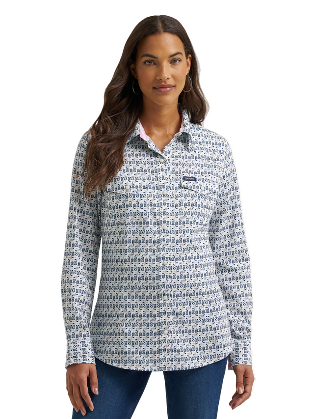 La chemise Wrangler Retro® Western Dress Snap Shirt pour femme, dans la couleur Blue, offre une allure western moderne à travers une coupe polyvalente et élégante. Conçue pour accompagner les cavalières comme les passionnées de mode western, cette chemise propose une silhouette fluide inspirée des classiques Wrangler®. Grâce à son mélange de lyocell, polyester et coton, elle procure une sensation douce au toucher tout en offrant un tombé souple et confortable.