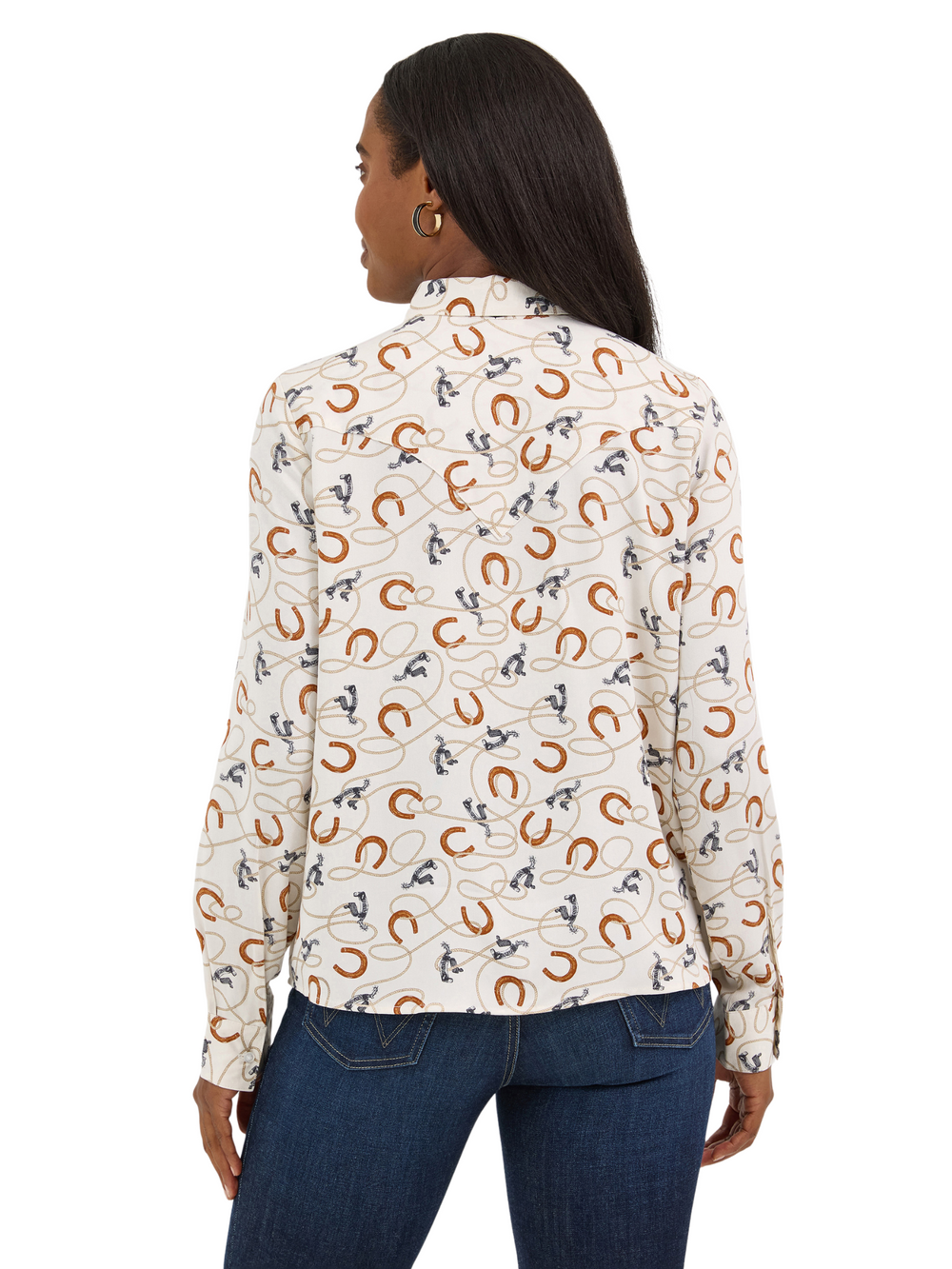 Le motif cowgirl, inspiré de l’univers équestre, mélange fers à cheval, cordes et éperons pour un style authentique et chic. La blouse est équipée de boutons-pression pratiques à l’avant et aux poignets pour un enfilage facile, tout en conservant une silhouette soignée. Parfaite pour le bureau, les sorties ou les événements western, elle se marie aussi bien avec un jean Wrangler que des pantalons habillés pour un look moderne et polyvalent.