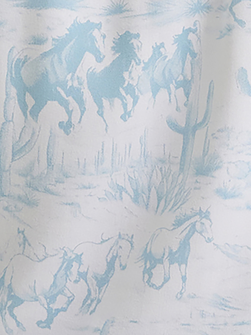 Les épaules sont structurées avec une découpe western simple, créant une silhouette nette. Cette chemise convient aussi bien pour le ranch que pour un look décontracté en ville. La viscose apporte légèreté et mouvement, ce qui rend la pièce agréable à porter toute la journée. La teinte blanche reste polyvalente et facile à agencer avec un jean, une jupe ou un short selon les saisons. Les motifs chevaux offrent une identité unique sans trop charger le style.