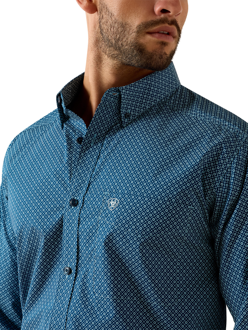 La chemise Ariat® Jordi à manches longues pour homme est conçue pour offrir un style soigné avec une coupe moderne et fonctionnelle. Son motif Poseidon Geo Print, dans des nuances de bleu, crée un look distinctif qui s’intègre facilement à une tenue western contemporaine ou plus urbaine.