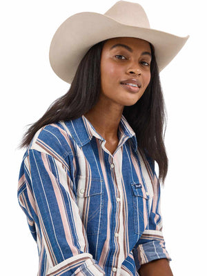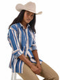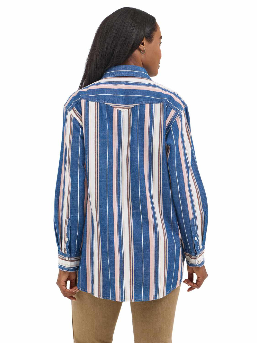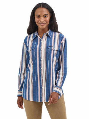 Chemise boyfriend Wrangler Retro® pour femmes. Style western bleu avec boutons-pression et coupe ample confortable.