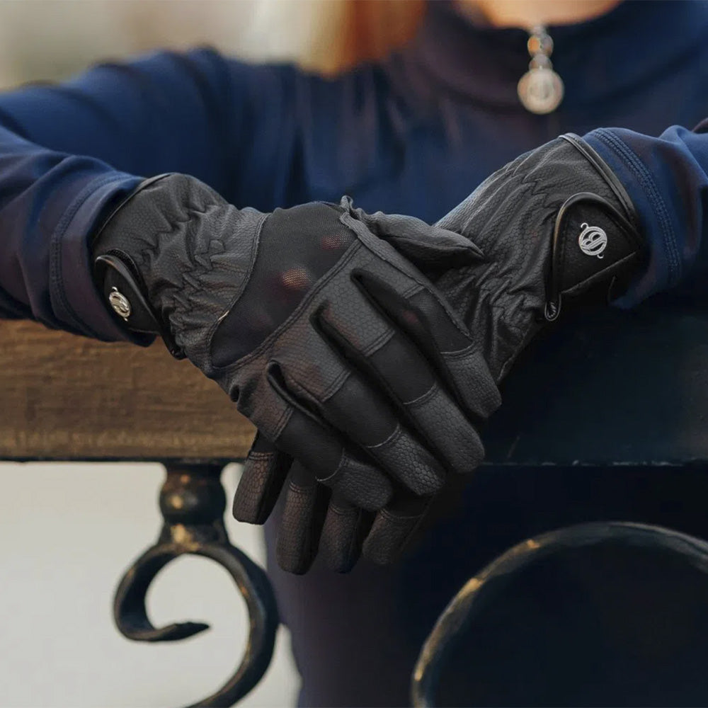 Les gants B//Vertigo Flex sont fabriqués dans un matériau souple et élastique pour un ajustement parfait. La poignée permet de tenir facilement les rênes. Le matériau en maille ajoute de la ventilation. Une petite sangle auto-agrippante assure le confort. Le détail du logo métallique ajoute une touche d'élégance.