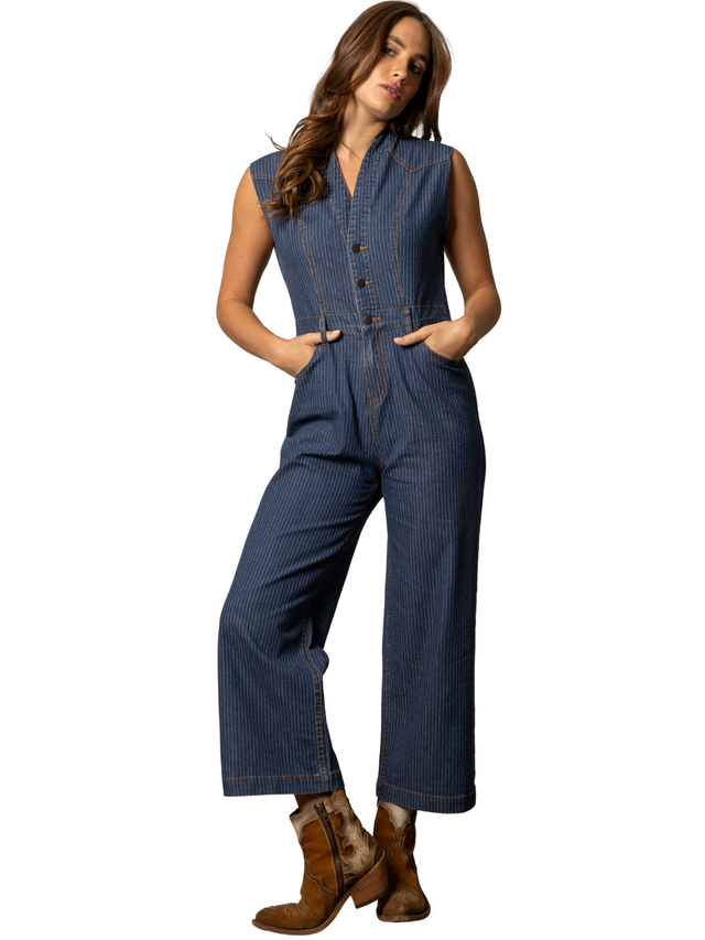 Le Kimes Ranch Hadley Jumpsuit pour femme est une combinaison sans manches au style western moderne, conçue pour offrir confort, liberté de mouvement et élégance décontractée. Fabriquée aux États-Unis, cette pièce se distingue par son denim mini-rayé de qualité supérieure et sa coupe relaxed fit, idéale pour un usage quotidien comme pour les sorties plus stylées.