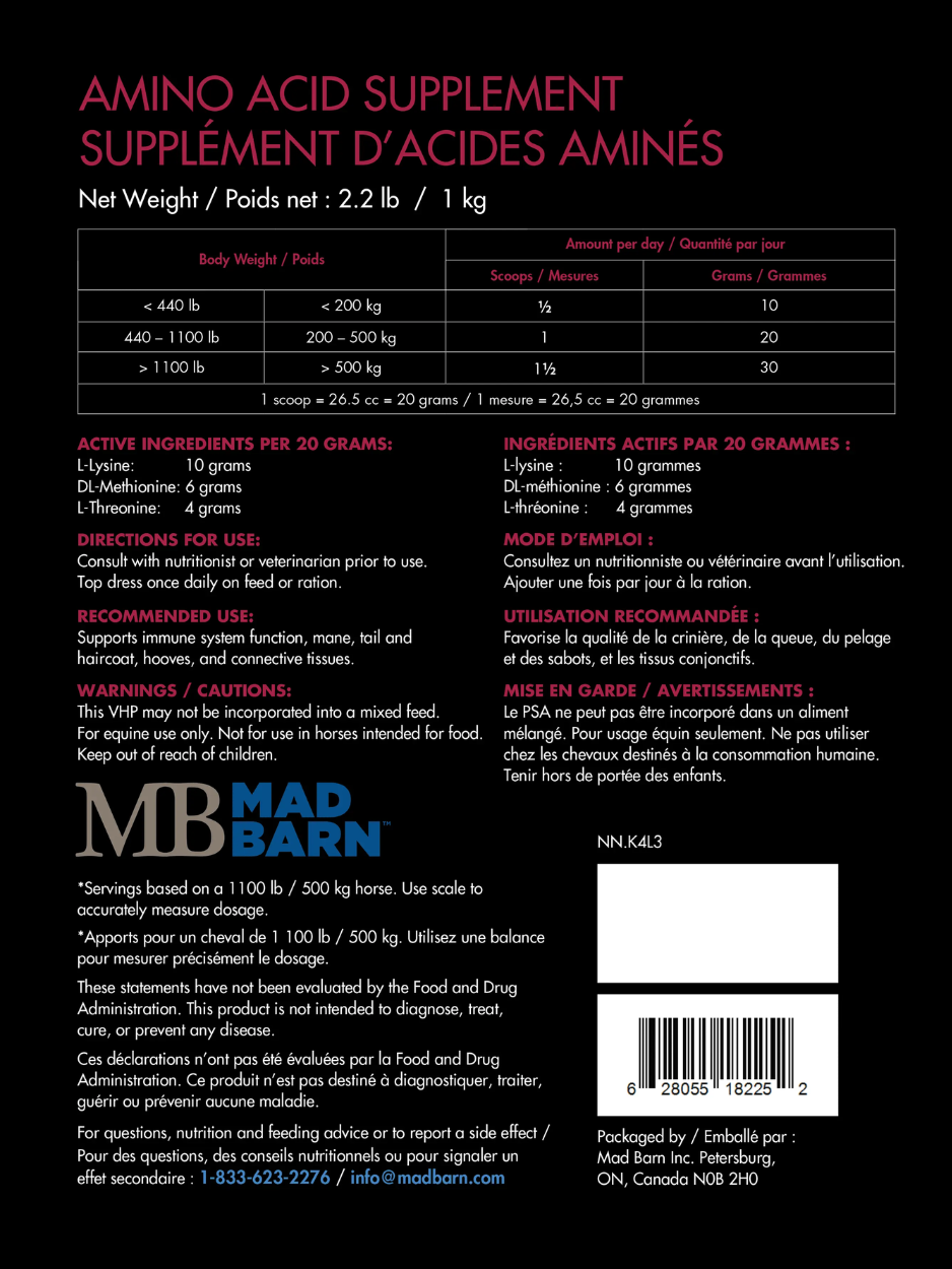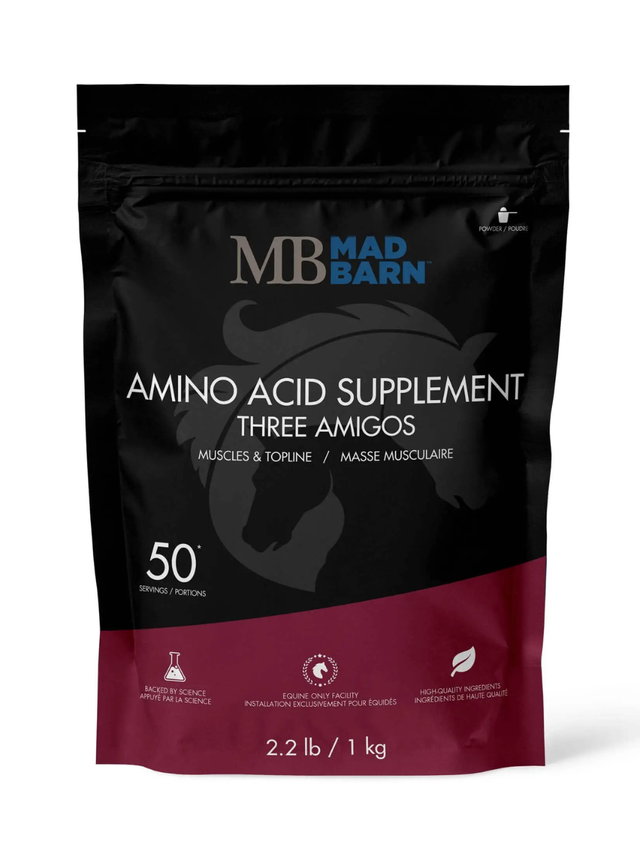 Three Amigos est un supplément d’acides aminés essentiels conçu pour soutenir la masse musculaire, la performance et la santé globale du cheval. Sa formule contient de la lysine, de la méthionine et de la thréonine dans un ratio optimal de 5:3:2, favorisant une synthèse protéique efficace.