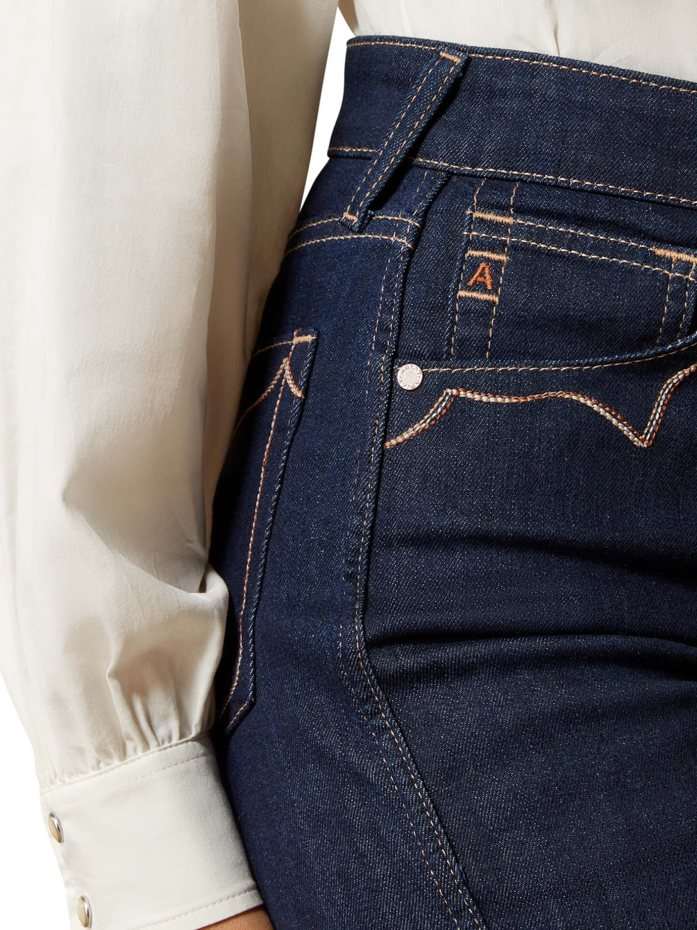 Les finitions soignées renforcent l’esthétique “ranch‑chic” : surpiqûres délicates, ceinture contournée qui épouse les formes pour une coupe qui suit vos mouvements. Ce jean est conçu pour briller autant en arène qu’en ville, combinant esthétique et fonctionnalité. Le tissu utilisé est un denim stretch de 10,75 oz composé de coton et de fibres techniques, garantissant robustesse, confort et une pointe d’écoresponsabilité.