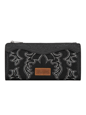 Ajoutez une touche western chic à votre quotidien avec ce portefeuille brodé Wrangler. Fabriqué en cuir synthétique, il présente un motif floral embossé, des coutures décoratives style botte et un logo appliqué. Son format à deux volets comprend un compartiment zippé, dix fentes pour cartes, une fenêtre pour carte d’identité et trois compartiments pour billets. Le tout, sécurisé par une fermeture à bouton.