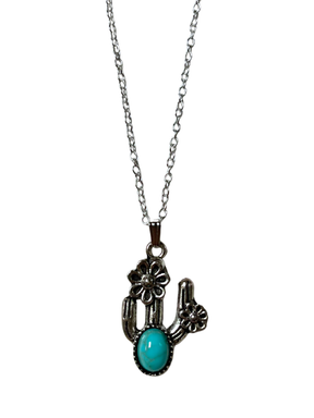 Collier de couleur argent avec breloque de cactus avec pierre turquoise