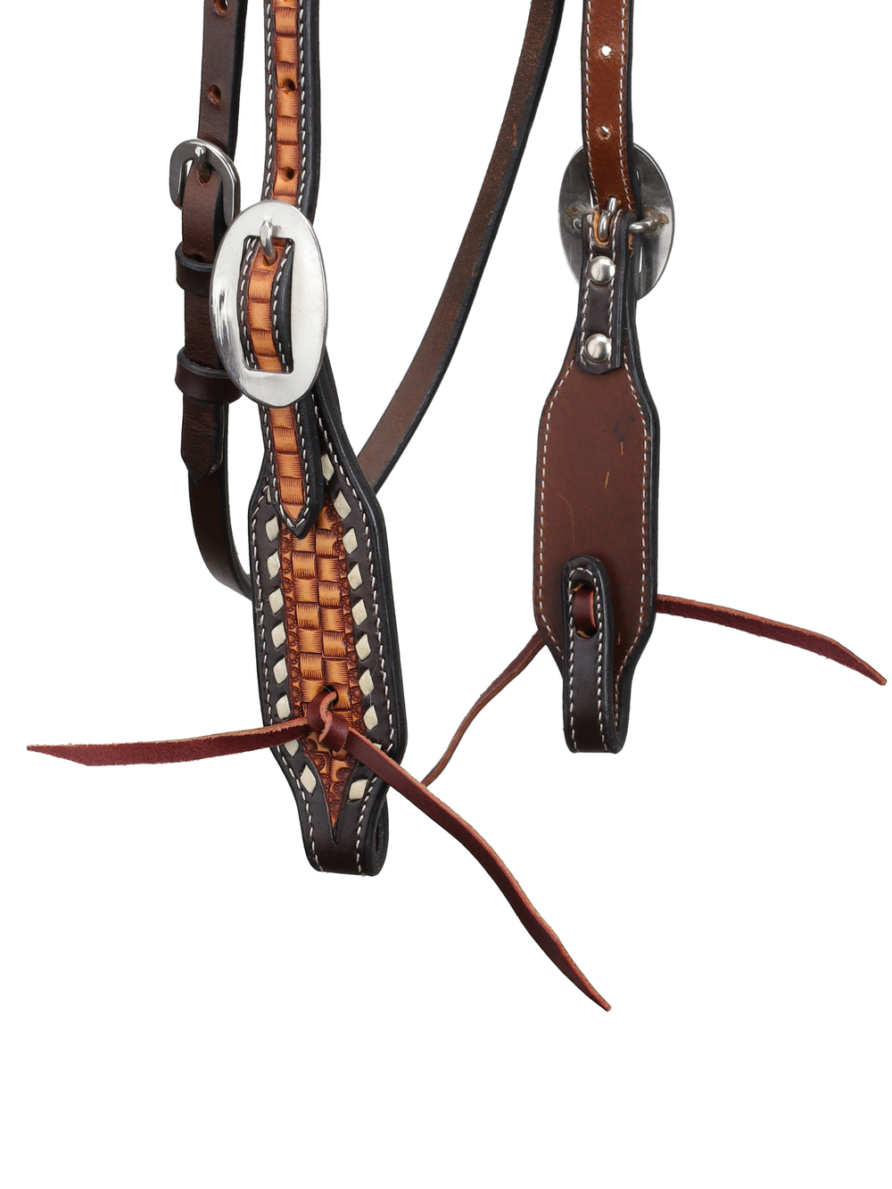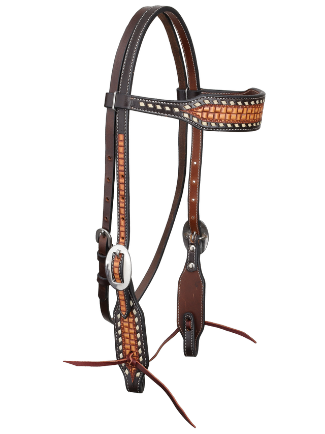 Alliant durabilité et élégance traditionnelle, la bride western à frontal Plains Patch de Showman® incarne le parfait équilibre entre fonctionnalité et style. Confectionnée en cuir de vache d’Argentine chocolat huilé, elle se distingue par son motif à outils panier carré moyen huilé, offrant un rendu artisanal authentique.