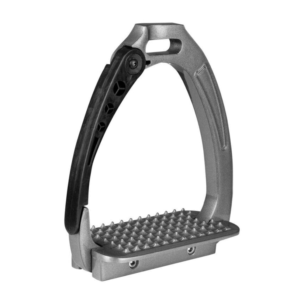 Étriers en aluminium de haute qualité avec une surface de marche large de 6,5 cm. Avec une charnière sur le bord extérieur. En cas de chute, la charnière s'ouvre sous le poids du cavalier et évite que celui-ci ne reste coincé dans l'étrier.
