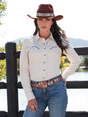 This cream long-sleeved shirt from Cruel Girl® embodies modern western elegance. Made for riders who appreciate comfort, style, and refined details, it features a feminine, structured cut, perfect for both competition and everyday wear. Black western-accented embroidery on the front and back adds a bold, understated look. Its snap closure makes it quick and easy to put on, and its adjustable cuffs ensure a secure fit under a jacket or on its own. Its soft, breathable fabric makes it comfortable to wear all day long. Both chic and functional, this shirt is a staple of classic equestrian style.