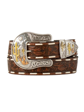 The Angel Ranch women's belt is a must-have accessory for western enthusiasts. Crafted from genuine brown leather, it features an embossed floral pattern and white nylon lace details, adding a touch of elegance to its rugged design. This belt features a three-piece buckle set with varying finishes, adorned with a raised desert scene and scrollwork, for a refined and distinctive look.