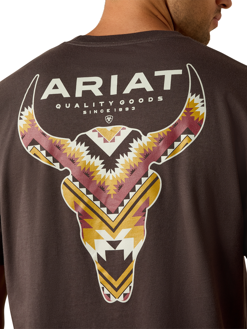 Côté design, ce modèle se distingue par une poche poitrine au motif aztec brun avec des accents orange et jaune, ajoutant une touche western originale à l’avant. À l’arrière, un grand imprimé longhorn attire le regard avec un motif southwest riche dans des tons de brun, beige et bourgogne, renforçant l’esthétique western emblématique de la marque Ariat.