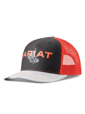 The Ariat men's cap combines style and comfort. With a 5-panel construction, it features a bucking wild horse motif, complemented by the Ariat name printed in red on the black front panel. The gray visor with red stitching adds a pop of color. The red mesh back provides ventilation, and the snapback closure allows for an easy, personalized fit.