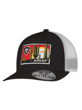 Show off your style with the Ariat Cap, featuring a desert scene patch. This structured, 6-panel cap, crafted in black fabric, is designed for comfort and style. The front features a rectangular Ariat patch showcasing a beautiful desert landscape illustration, while black stitching adds a touch of sophistication. The white mesh back provides optimal ventilation, and the snapback closure ensures a perfect fit, whether you're out and about for a day outdoors or a casual outing.