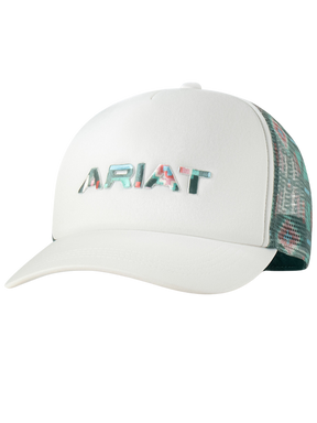 Add a touch of elegance to your style with the Ariat PonyFlo women's cap. This trucker-style cap, designed by M&F Western Products, combines comfort and style. The structured white foam front and matching visor are accented with a multi-colored 3D embroidered Ariat logo, adding a vibrant touch. The light blue mesh back provides excellent ventilation, ideal for warmer days. With a Velcro closure, this cap fits snugly around your head for optimal comfort.