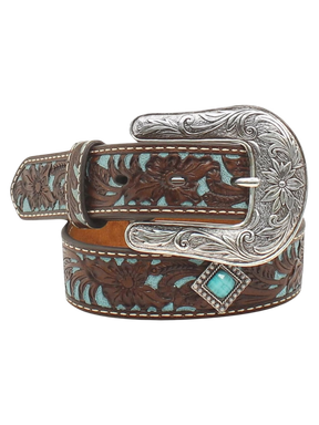 The Ariat girls' belt is a stylish and unique accessory to complement western and fashion outfits. Crafted from a turquoise leather base, it features an embossed floral pattern and is embellished with diamond-shaped turquoise stone conchos.