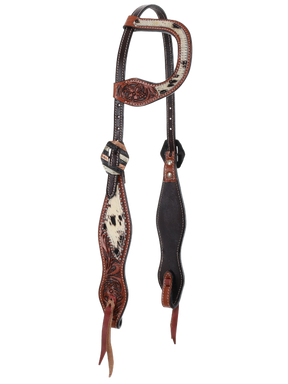 The Showman® Western Luxe Series Iris Single Ear Bridle combines quality craftsmanship with refined style. Crafted from medium oiled leather, it features an engraved floral pattern and elegant hair-on cowhide covering.