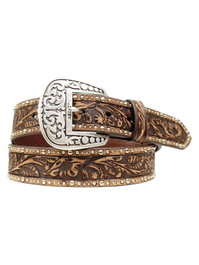 This Ariat women's genuine leather belt, with its elegant, embossed design, is perfect for adding a touch of style to your outfits. Its 1-1/2" width makes it ideal for complementing your favorite jeans or any casual outfit. The removable silver buckle, accompanied by decorative studs around the edges, gives this belt a neat and sturdy finish.