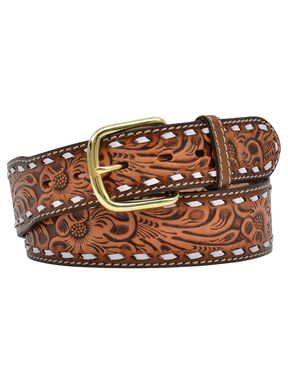 Add a touch of natural style to your outfit with this full-grain leather belt embossed with floral patterns. It is crafted from high-quality leather and features a beautiful contrast with exposed white leather stitching. The belt is wider at the waist, at 1 3/4”, and tapers to 1 1/2” at the ends, for a perfect fit. The removable brass buckle offers the option to customize the look, allowing it to be combined with different styles.