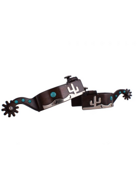Showman® brown steel spurs add a unique touch to your equestrian equipment. Their design includes silver trim and teal marbled studs, offering a distinctive style.