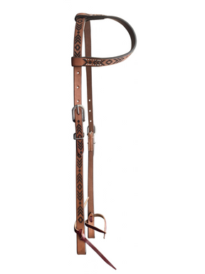 The Showman® One Ear Argentina Leather Headstall is a stylish and functional piece of equestrian equipment. Made from medium-grain Argentine leather, this bridle features a black Aztec pattern that adds a distinctive touch of style. It features a single ear and cowboy ties for a secure fit. Please note that reins are not included. This bridle is the perfect choice for those seeking both quality and design.