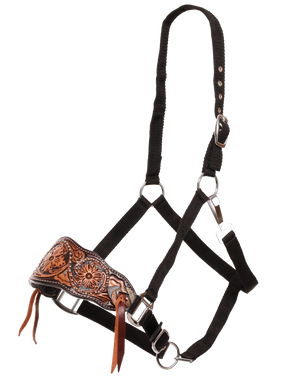 Make a statement with the Showman® Magnolia Black Nylon Bronc Halter, combining western style with practical functionality. This halter features a beautifully hand-engraved leather noseband adorned with a magnolia floral motif framed in a dark finish for a classic, refined look. Silver stud accents and copper and silver conchos add a touch of elegance, ideal for everyday use or events.