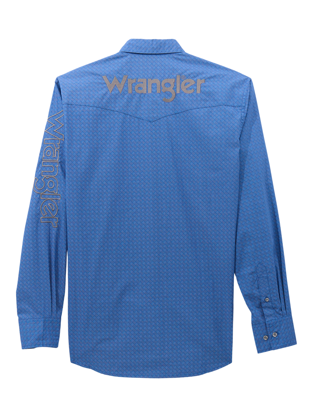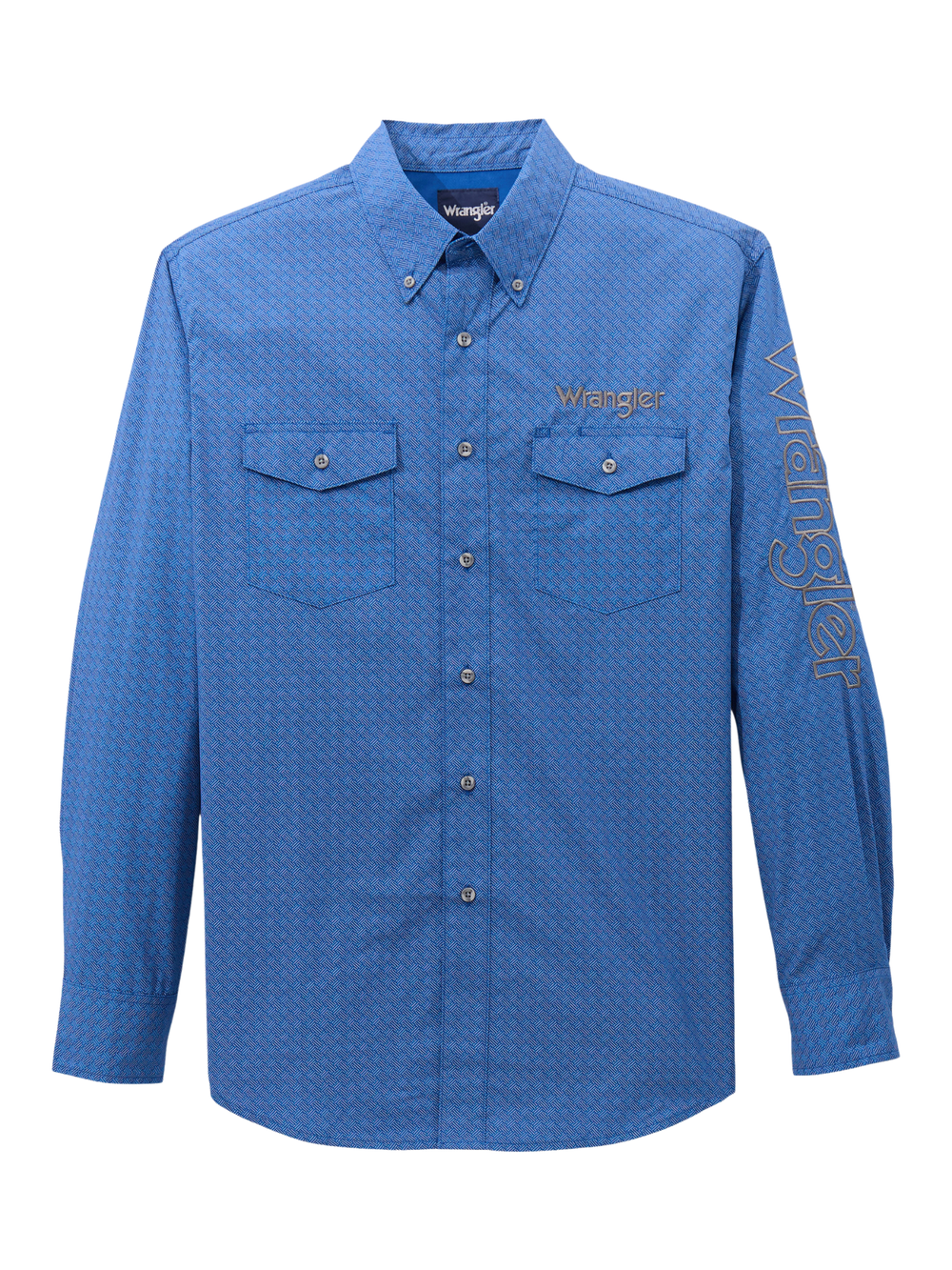 Wrangler® Logo Men's Long Sleeve Button-Down Shirt, True Blue. 100% cotton, authentic western style with yokes and convenient pockets.