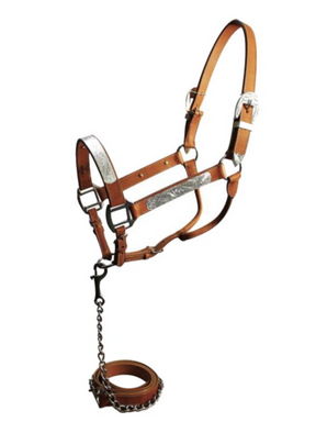 The included matching leather lead rope, with a nickel-plated chain, complements the halter's silver details perfectly, ensuring a flawless presentation. Whether for competitions or in-hand presentations, this halter and matching lead rope ensure you look elegant and professional.