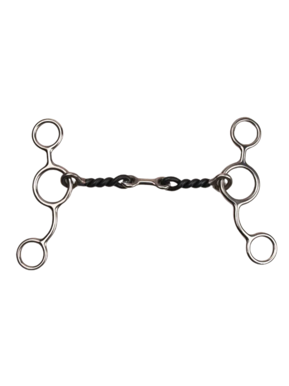 This short shank bit offers gentle leverage. It features twisted mouthpieces for improved responsiveness and a dog bone centerpiece that helps prevent the infamous nutcracker action. The sweet iron helps with both salivation and bit acceptance.