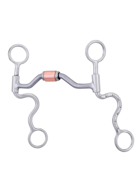The François Gauthier bit is a 5 " soft iron curved and pierced mouthpiece. The mullen relief and copper cylinder provide comfort for the horse. The S-shaped shanks are 6 1/2" with silver points. The bit is good for developing a soft mouth for the young to intermediate horse. Light to moderate effect.