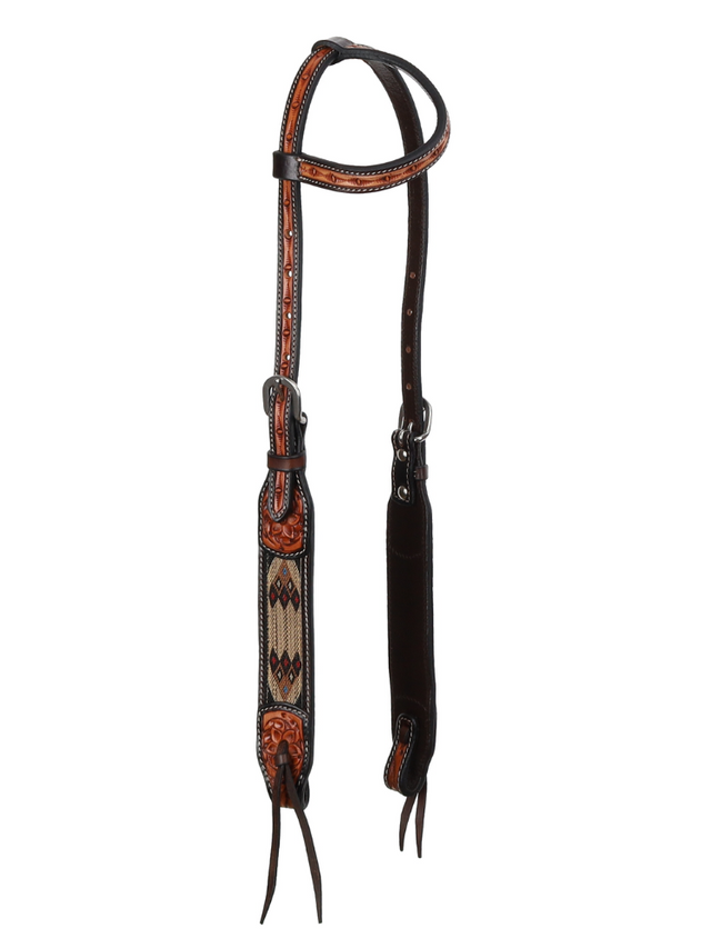 Desert Loom Showman One Ear Bridle – This unique bridle combines oiled leather, a classic floral pattern, and a colorful woven insert. Perfect for a bold western look. Suitable for western riders seeking comfort and style.
