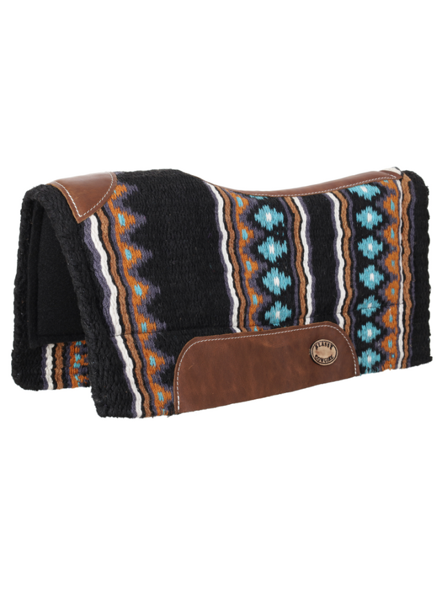 The Klassy Cowgirl® 28” x 30” Barrel Style Saddle Pad combines performance with vibrant western style. Its woven wool top, in shades of turquoise, orange, and brown, offers both strength and a vibrant look. The contoured spine ensures a secure and comfortable fit, reducing pressure points and improving saddle stability. Built to last, it is reinforced with a leather spine and wide, full-grain leather reinforcements in high-wear areas, effectively protecting against friction.