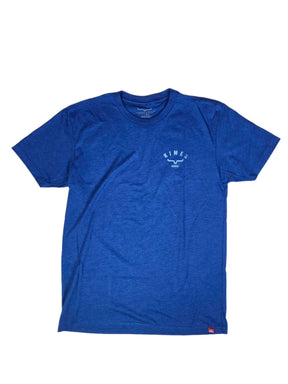 Kimes men's Cut Through short-sleeved t-shirt in a cotton and polyester blend. The company logo is printed on the front and back of the t-shirt in white and sky blue.