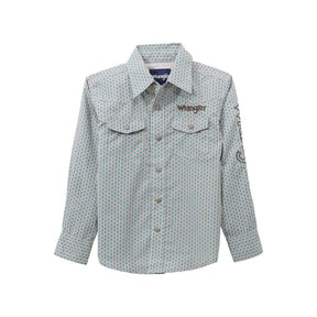 The Wrangler Logo Long Sleeve Shirt for boys combines comfort, western style, and durability to keep up with all their adventures. Made from 100% cotton, it's soft against the skin yet durable for everyday use. The classic design features the Wrangler logo on the chest, adding an authentic, modern western feel.