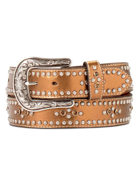 Add a unique and sparkling touch to your look with this Ariat women's metallic copper belt. Designed with a metallic synthetic top and genuine leather underside, this belt is decorated with shiny silver studs and copper crystals for a dazzling look. The antique silver buckle, adorned with floral engraving, completes this elegant design, ideal for western and fashion outfits.