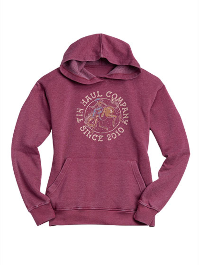 Show off your Western style with this women's Tin Haul Buckin' Bronc Rider hoodie, in a red hue with burgundy undertones for a bold and dynamic look. This style features a circular "Tin Haul Company Since 2010" print alongside a cowgirl in action on a bronc, a symbol of the adventurous and untamed spirit of the ranch.
