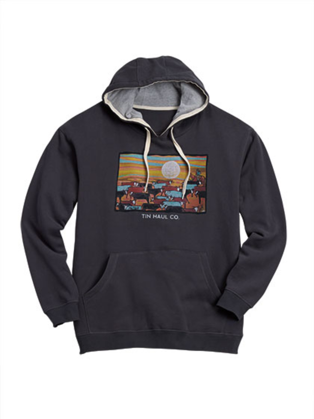 Embrace classic Western style with this men's Tin Haul Herd of Cattle hoodie. The charcoal gray hue, complemented by a heather gray lined hood, highlights a central print of a herd of cattle at sunset in a hand-painted style. This hoodie combines Western aesthetics with everyday comfort, perfect for outdoor activities or relaxing after a day at the ranch.