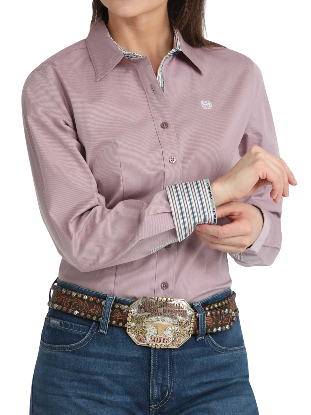 Show off a polished Western style with the CINCH Lily Yard Dyed Stripe women's shirt, designed for everyday comfort and elegance, whether you're in the stable, in the saddle, or out on the town. Its lilac striped fabric, woven from cotton and spandex, offers a refined look while remaining soft and comfortable to wear.