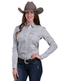 The Stretch Four Point Foulard Grey women's western shirt from Roper's Amarillo collection combines classic elegance with modern comfort. Its subtle and refined scarf pattern adds a sophisticated touch to traditional western style, while remaining easy to style for everyday wear. Its versatile grey hue allows for the creation of understated or contrasting outfits, suitable for both stable work and outings in town.