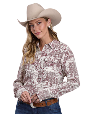 The women's Desert Toile western shirt from Stetson's Spring II collection embodies the elegance of Western style, reimagined with an artistic and refined touch. Its "Desert Toile" print showcases motifs inspired by desert landscapes, creating a unique, authentic, and timeless look. This shirt is ideal for equestrians and Western fashion enthusiasts who want to stand out with subtlety.