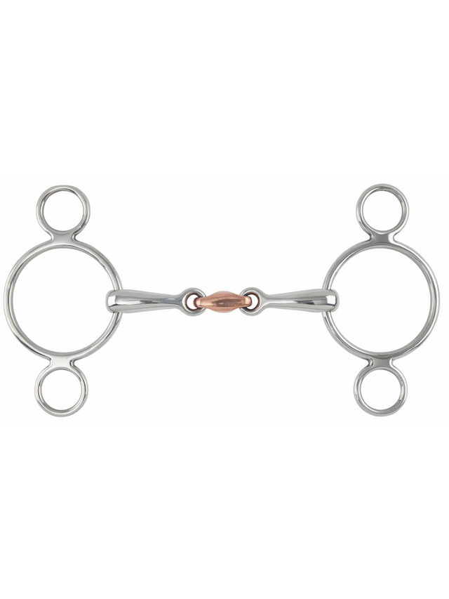 This bit allows the rein to be placed on the main ring or the smaller lower ring to increase leverage while the copper pad encourages the horse to salivate.