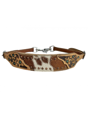 The Showman Hair On Cowhide wither strap with teal accents adds a distinctive Western touch while providing stability and functionality to your gear. Made of genuine leather with real cowhide inserts, it combines durability with authentic ranch style.