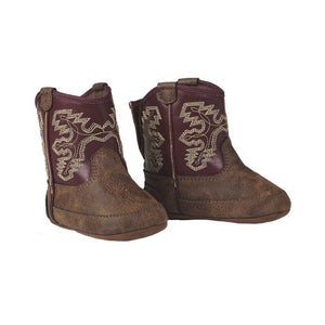 Votre tout-petit fera certainement sensation avec ces bottillons Blake pour bébés de M&F Western Products. Tige bordeaux décorée d'un design de couture tan et de tire-bottes. Fermeture Velcro sur le côté pour un enfilage et un retrait faciles. Tellement confortables que votre petit cow-boy voudra les porter toute la journée.