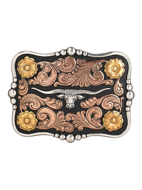 Affichez fièrement votre style western avec cette superbe boucle Nocona pour adulte, signée M&F Western Products. De forme rectangulaire à bord festonné, elle met en valeur une tête de longhorn au fini argent antique sur un fond noir mat, pour un contraste saisissant.
