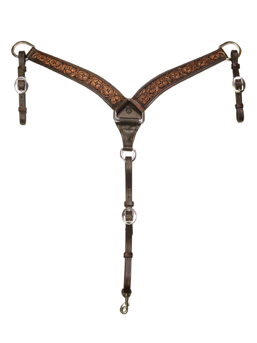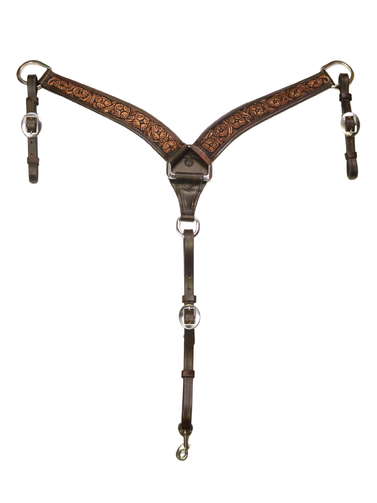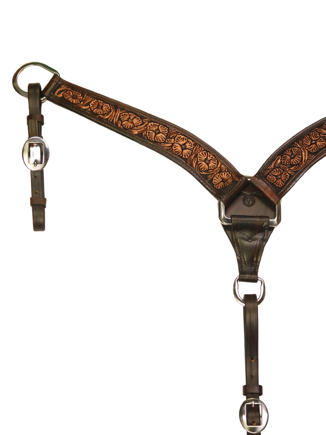 Son ajustement contourné épouse parfaitement les épaules du cheval, assurant confort et liberté de mouvement. Le motif floral sculpté à la main et la finition vintage brun foncé créent une allure élégante et classique. L’utilisation de quincaillerie en acier inoxydable garantit une résistance maximale aux éléments.